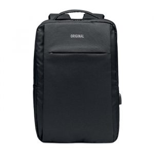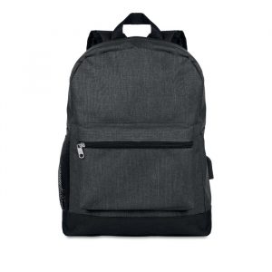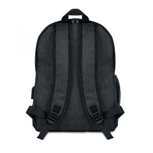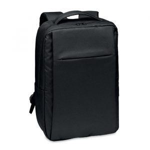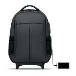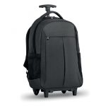 Backpack trolley in 360D 2 tone polyester. Includes one internal 15 inch laptop compartment and one main front part with zipper pocket. Padded back and shoulder straps. Includes Tablet compartment. Has an integrated sleeve for protecting the wheels when carrying.