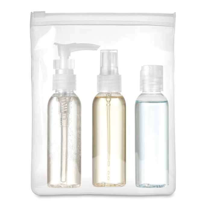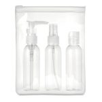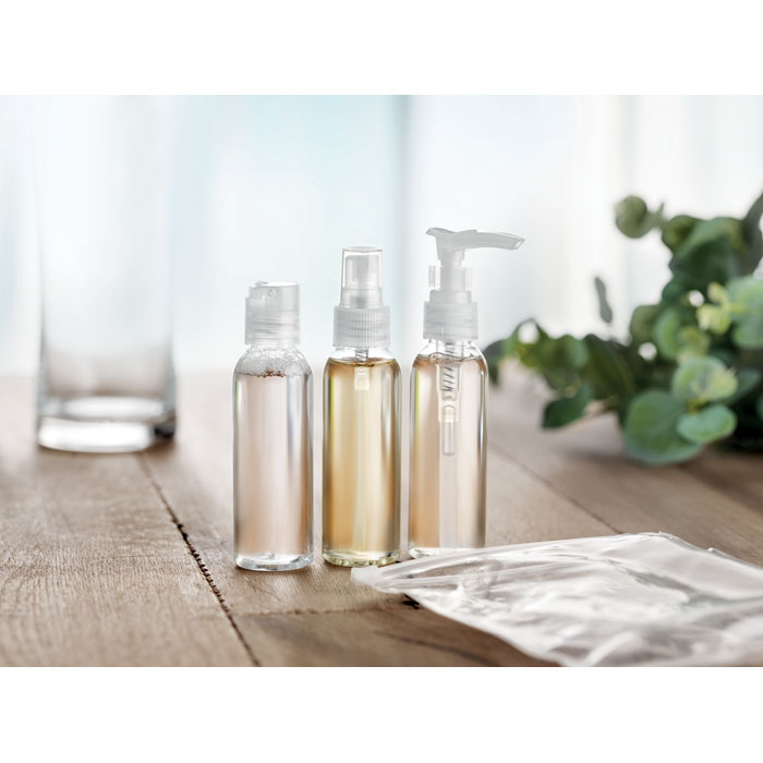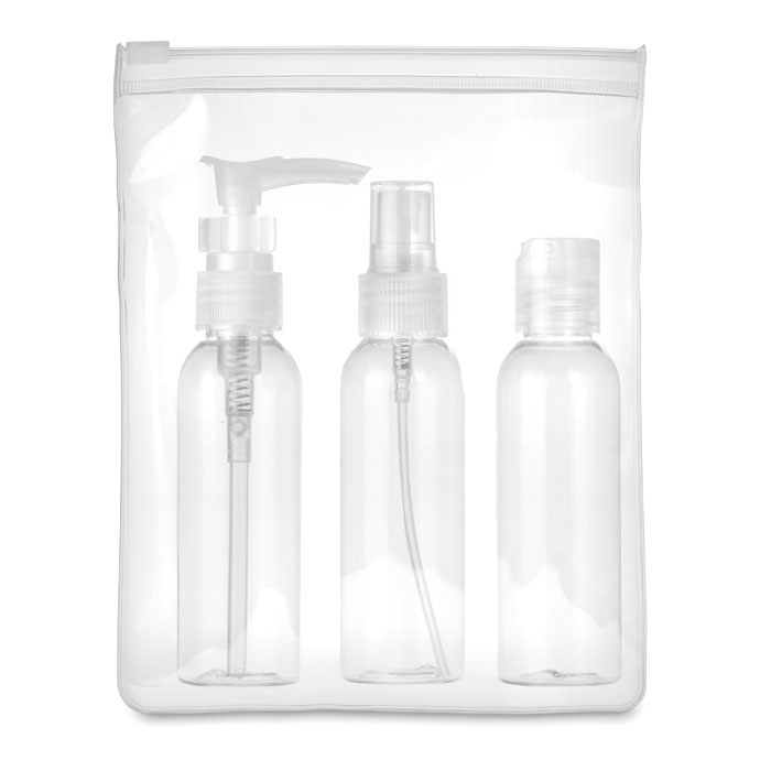 Plane travel pouch including 3 empty PP bottles presented in transparent PEVA pouch. Capacity 60 ml per bottle.